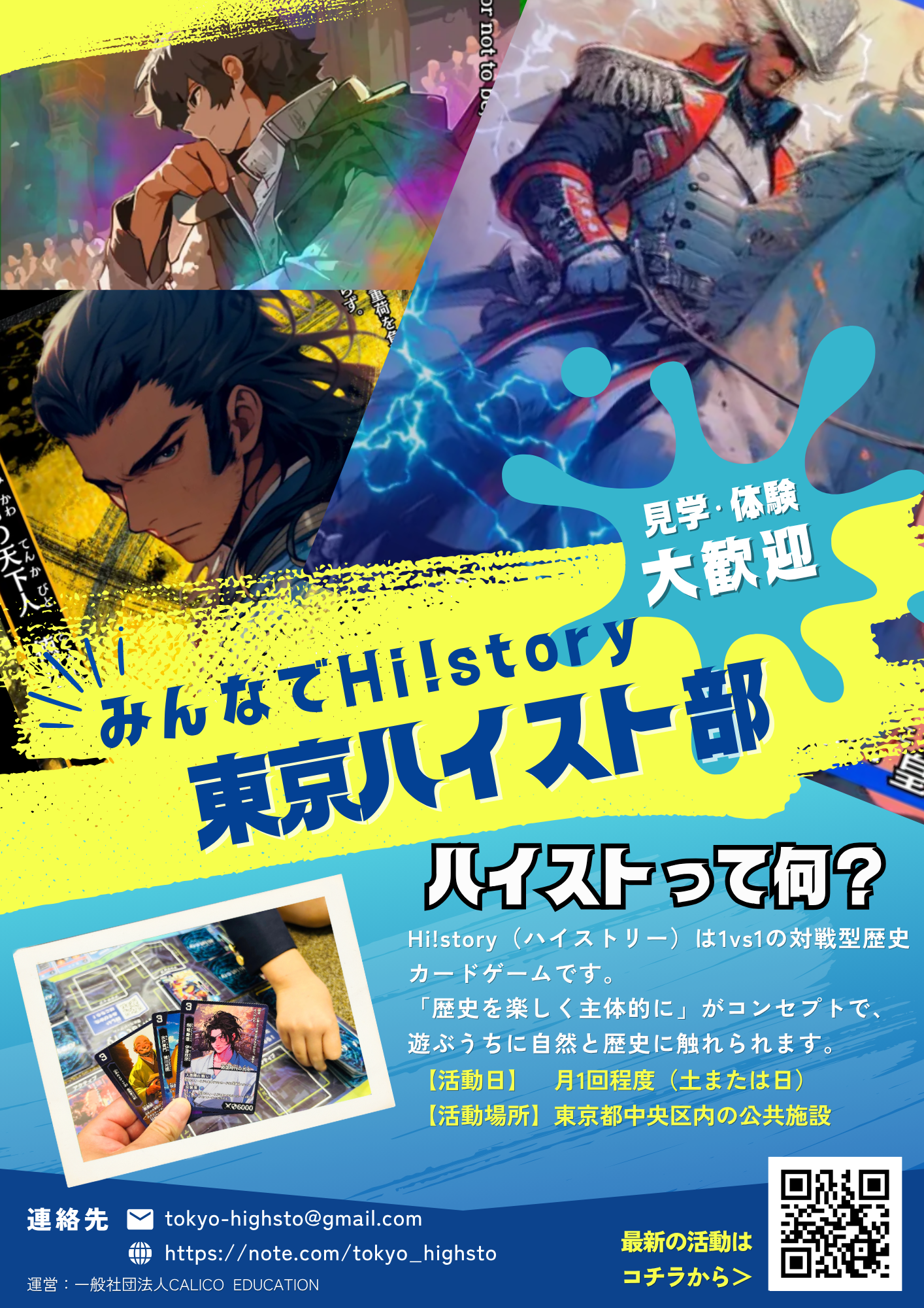 歴史カードゲーム「Hi!story(ハイストリー)」 を楽しむ仲間が集う非営利コミュニティを運営しています。小学生から社会人まで、初心者も経験者も大歓迎ですので、関心がある方は気軽にお問い合わせください!